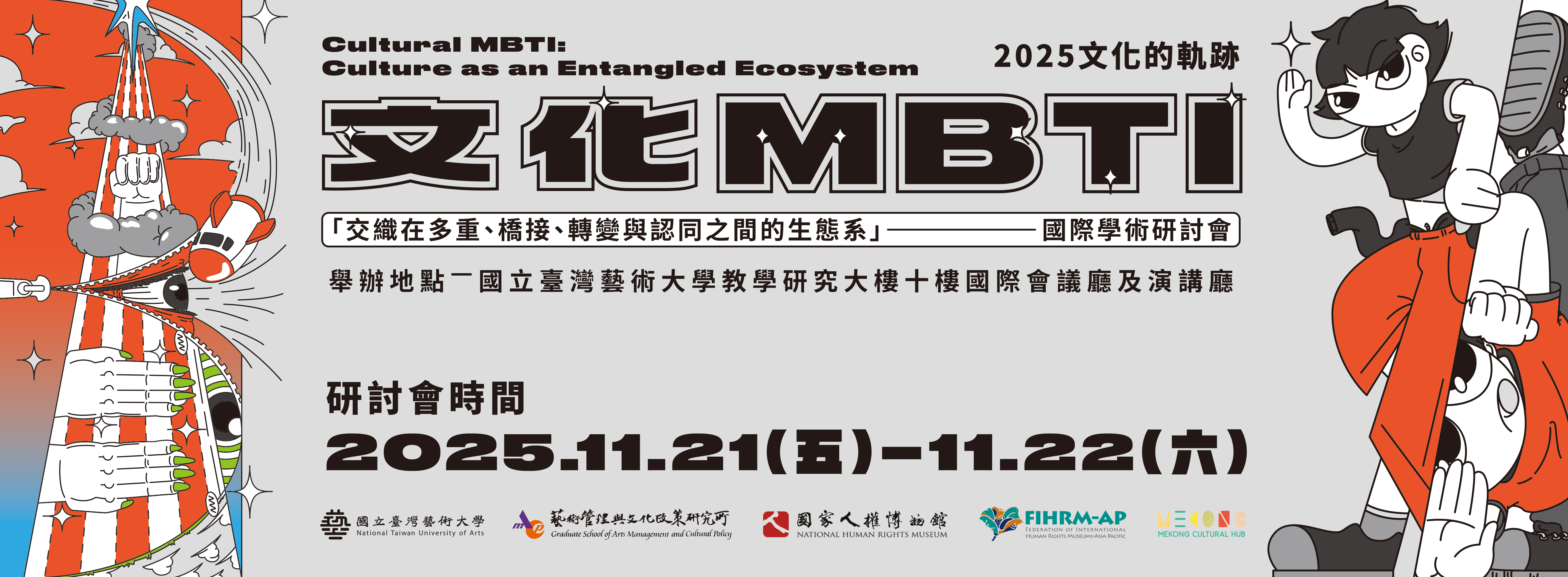 | 公告內容 | 一、本校藝術管理與文化政策研究所、國家人權博物館、國際人權博物館聯盟-亞太分會、國際生活藝術組織台灣辦事處(又名:湄公河文化中心)合辦之「文化 MBTI——交織在多重、橋接、轉變與認同之間的生態系」-國際學術研討會於114年11月21日、22日在本校教學研究大樓10樓國際會議廳、演講廳舉行。 |
