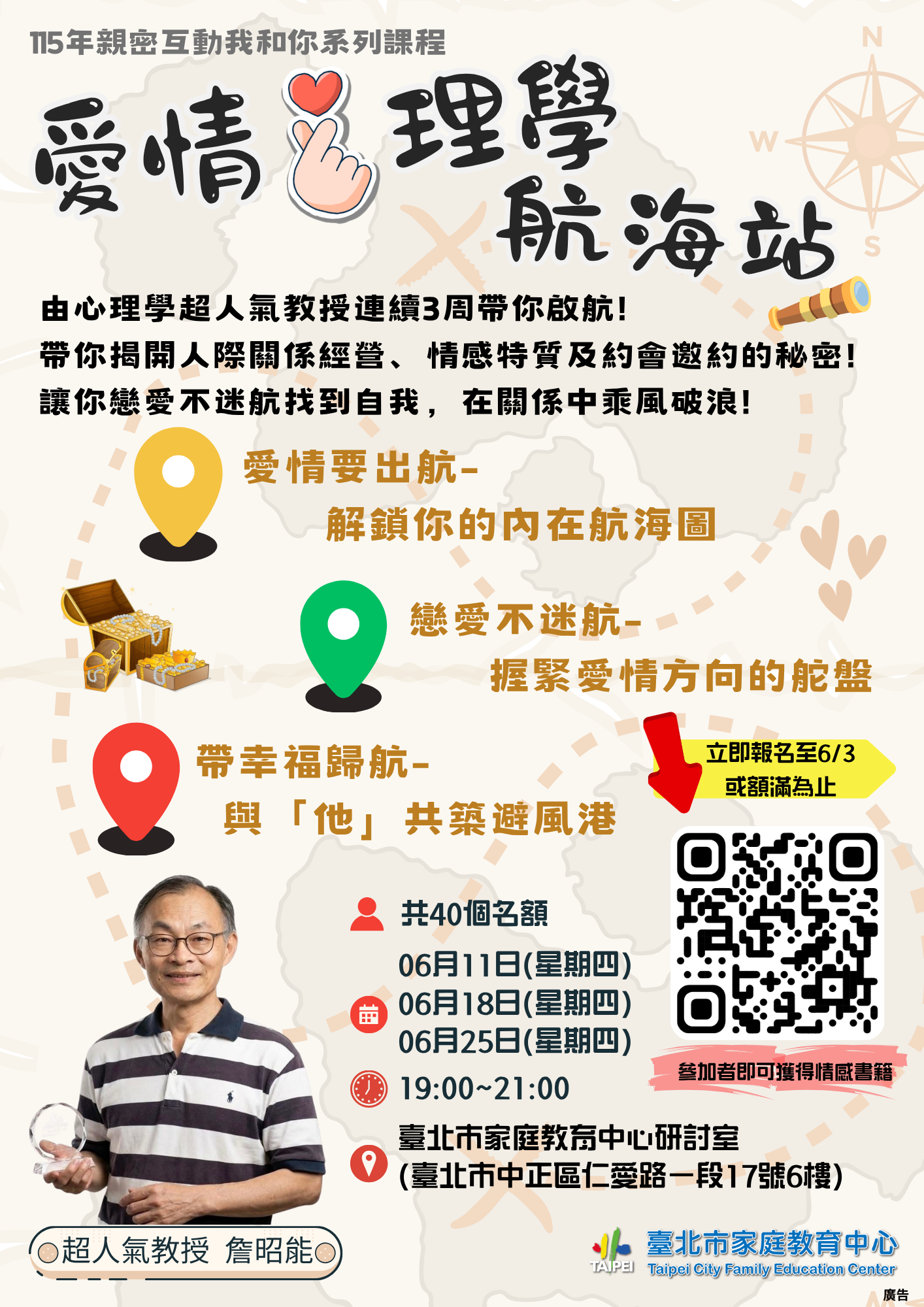 | 公告內容 | 「臺北市家庭教育中心『親密互動我和你–愛情心理學航海站』課程(活動全程免費參與) 一、時間:115年6月11日至6月25日,連續3週於星期四晚間7時至9時。 二、地點:臺北市家庭教育中心 三、對象:一般市民,全程參與之公務人員可申請終身學習(研習)時數6小時活動 四、報名:名額為40人,詳細內容可於中心網站(https://family.gov.taipei)課程與活動瀏覽及下載。 五、聯絡人:請洽25419690轉605 |