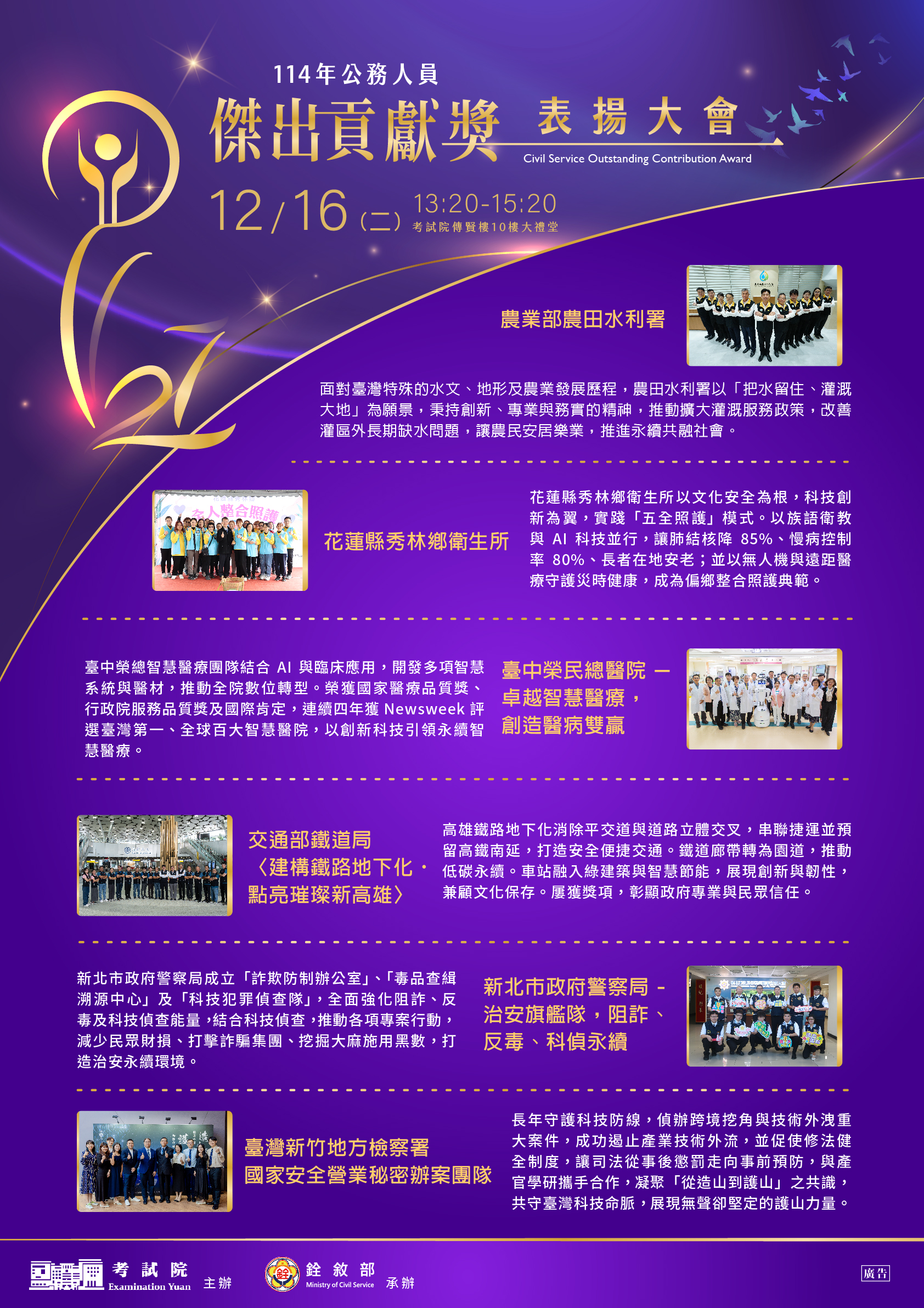 | 公告主旨 | 人事處關於銓敘部函請協助公告「114年公務人員傑出貢獻獎表揚大會」電子海報 |