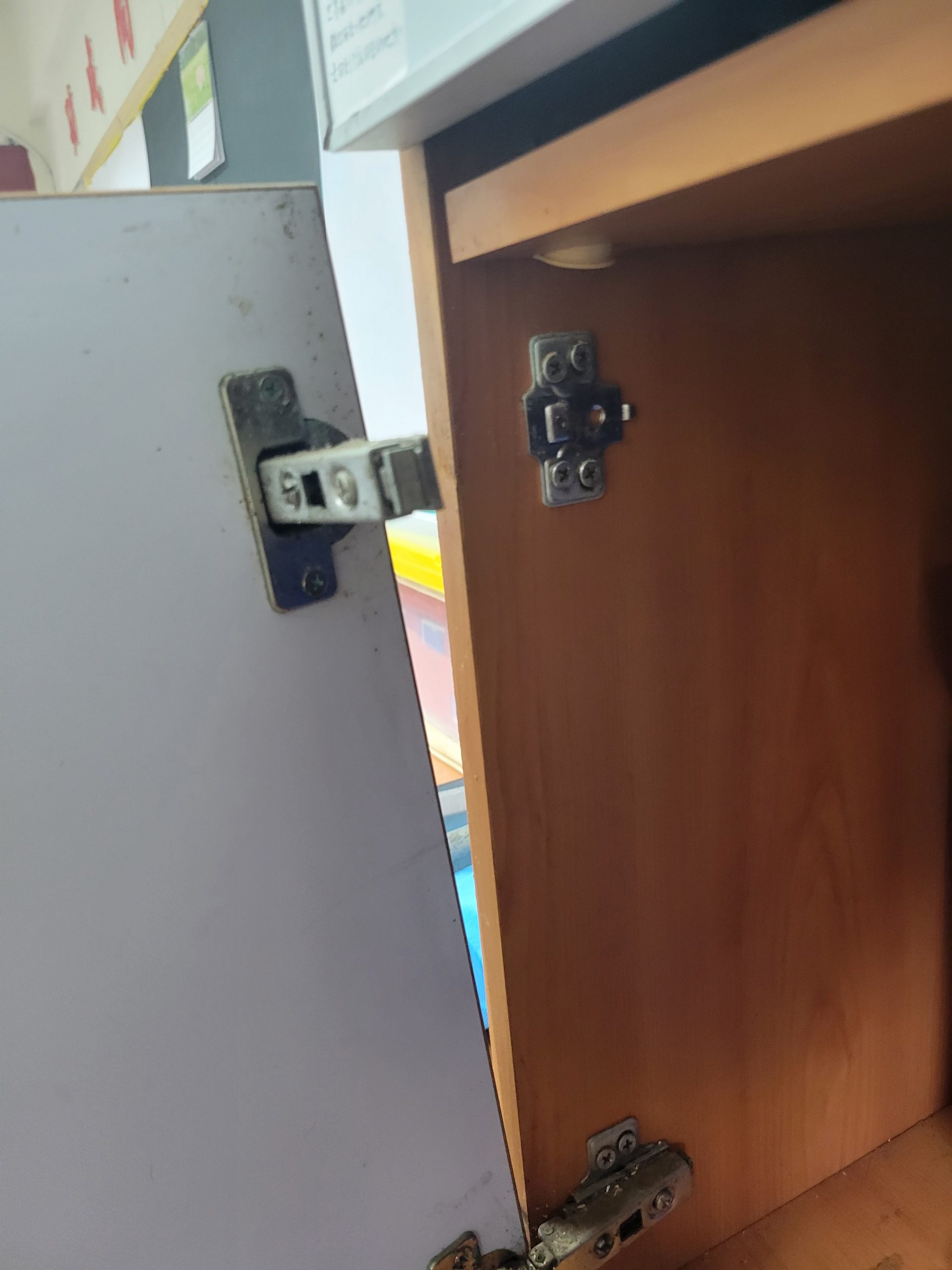 鉸鏈脫落 上傳照片 教室後面放垃圾桶的櫃子掉下來了,一個鉸鏈脫落